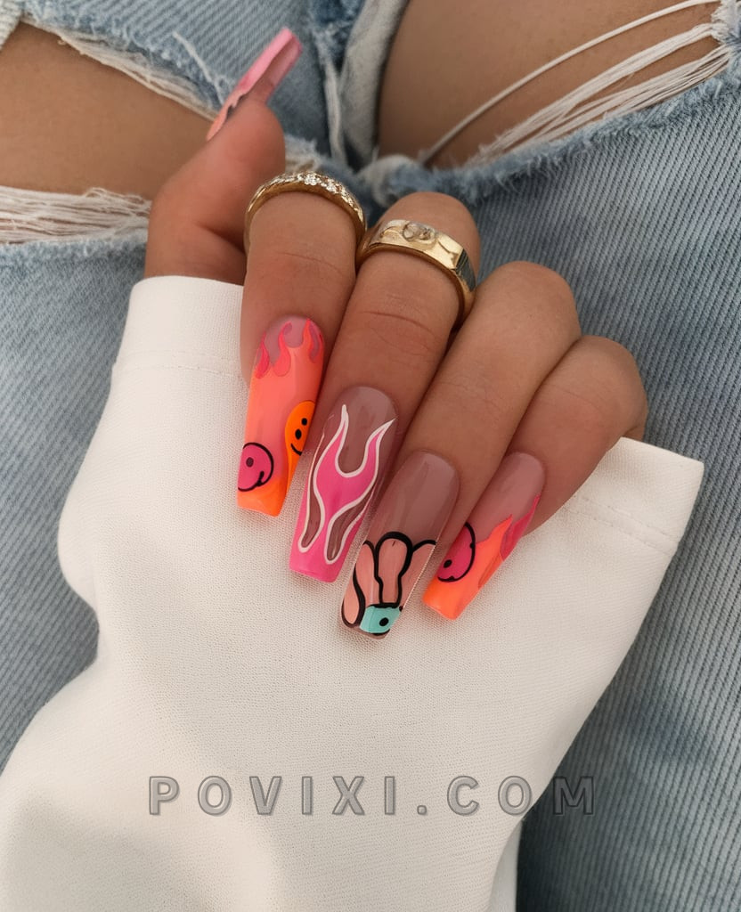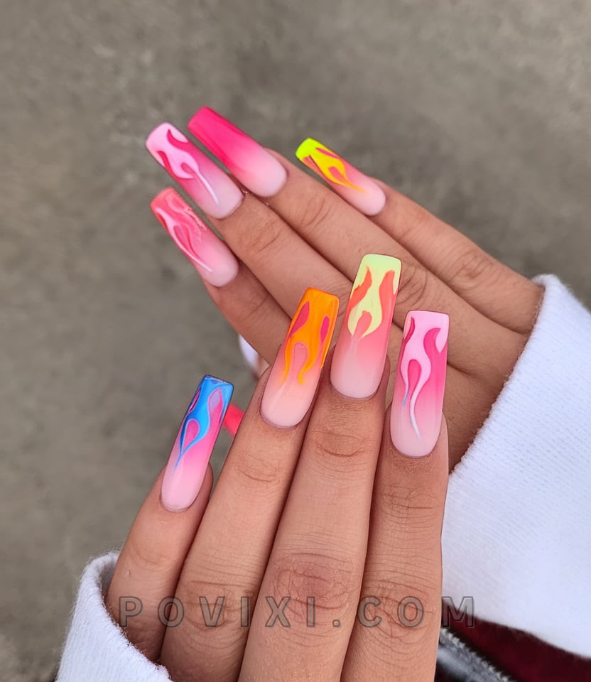 This liquid flame-inspired nail design creates multiple ombre transitions between pink, orange, yellow and blue to replicate a summer sunset. The combination of the matte finish creates texture, yet the elongated coffin nails offer top runway styles. The nail design works with casual denim outfits as well as elegant evening cocktails as it serves as an effective transition piece between the beach and evening activities. Safe and fiery nail designs suit confident individuals who love bold fashion.