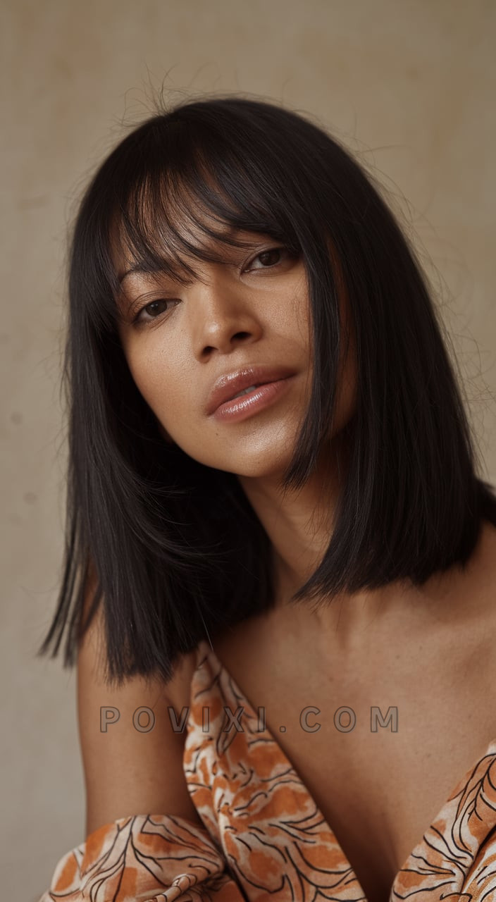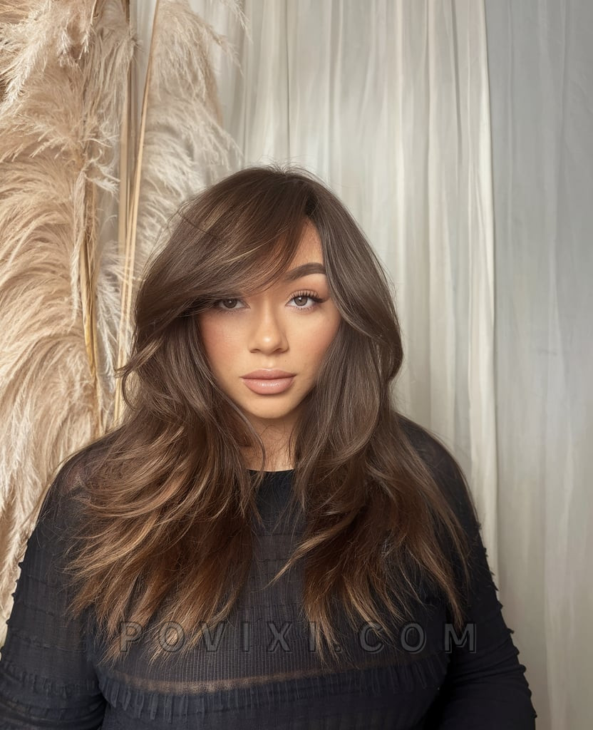 This long-layered style with dramatic bangs brings both glamour and movement. The swoop effect frames the face and adds softness, while the cascading layers add dimension and flow. It’s perfect for summer weddings, parties, or simply for women who love their length. It also flatters fuller face shapes by elongating the neck and highlighting the cheekbones.