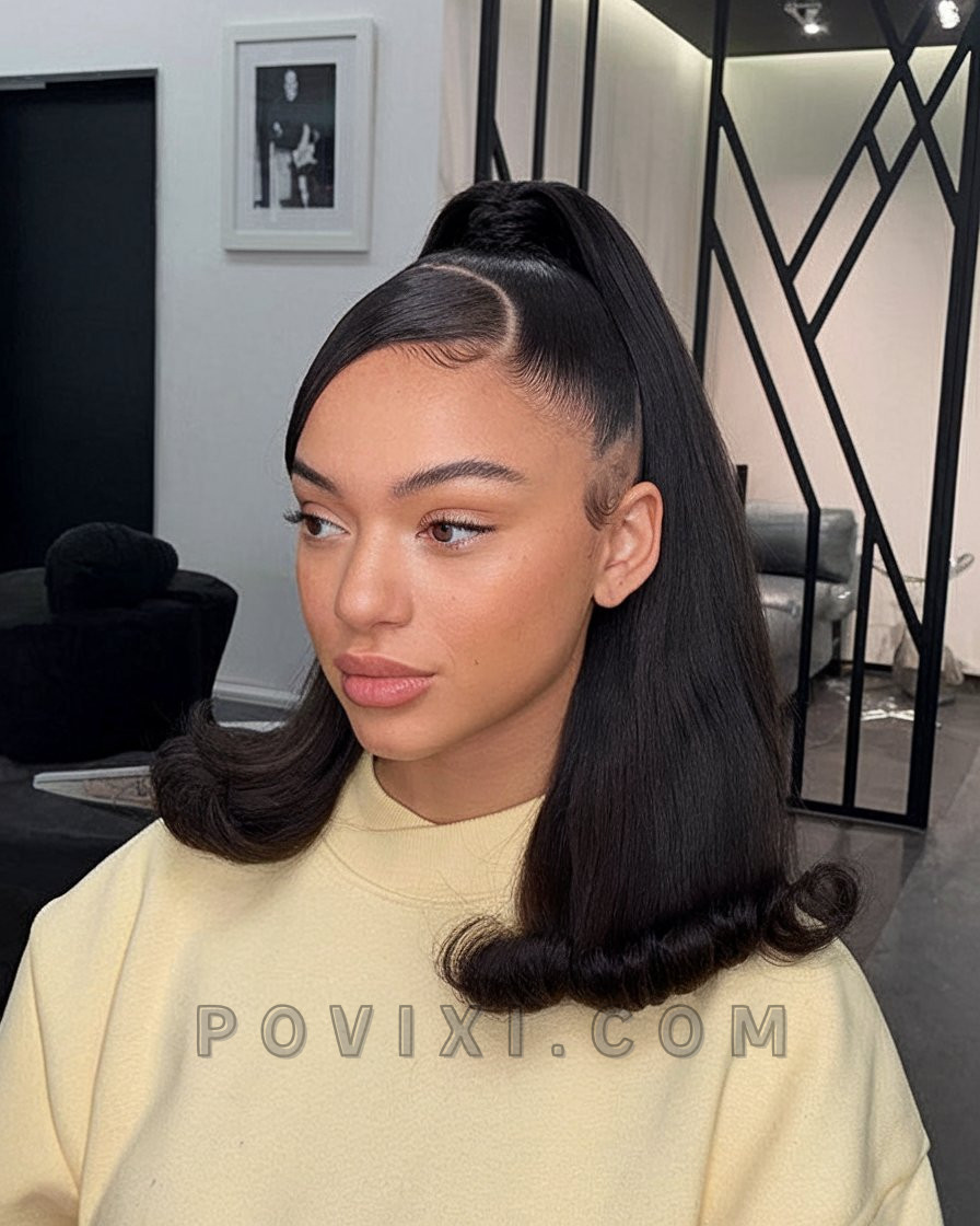This dramatic ponytail is all about length and movement. The high, slicked-back top provides structure, while the cascading wavy ends bring beachy energy. It’s an ideal style for women who love showing off length — whether it’s natural, through weave, or a wig. Perfect for summer events, fitness outings, or just when you want to feel unstoppable. Use a styling wax to smooth flyaways at the base and wrap a section of hair around the ponytail holder for a polished finish.
