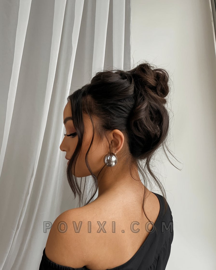 This is effortless elegance defined. The hair is styled into a loose, textured bun with softly curled tendrils falling naturally along the neck and jawline. Ideal for women with thick, long hair, this style is all about soft structure. This look pairs beautifully with off-the-shoulder tops or dresses and is well-suited for weekend brunches, garden parties, or even summer weddings. Use a curling wand to create tousled pieces before pinning up. Let a few strands fall freely to add that breezy, effortless appeal.
