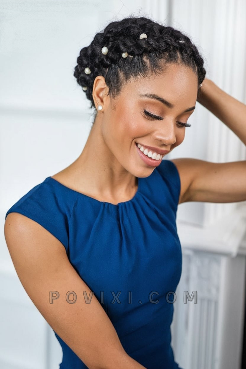 Intricate yet ethereal, this style features cornrowed braids wrapped elegantly around the crown, adorned with delicate pearls for a touch of whimsy. It’s a sophisticated protective style that doesn’t sacrifice beauty for practicality. This hairstyle is great for corporate settings or summer soirées and offers all-day wear without discomfort. Moisturize your scalp beforehand and add accessories like pearls, gold rings, or cuffs to personalize the look.