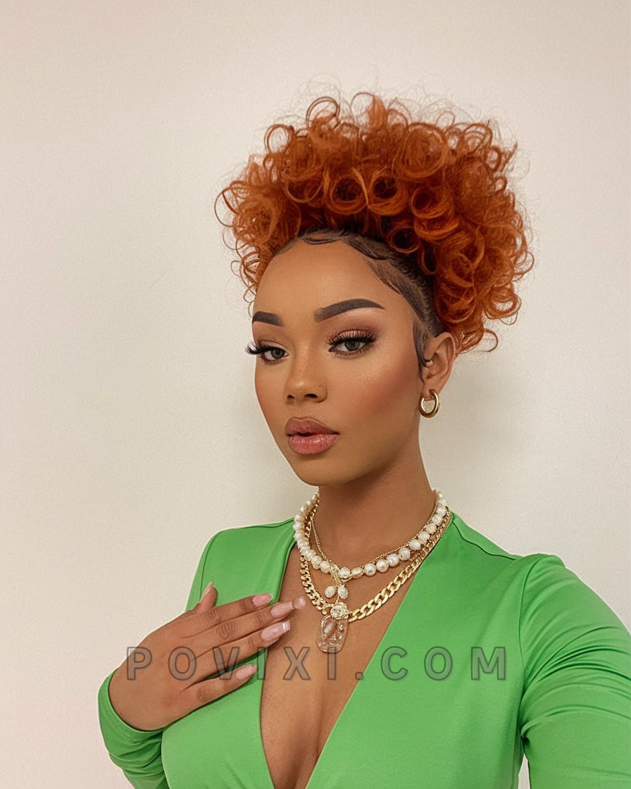 Go bold with a curly puff in a show-stopping color — this vibrant ginger-orange hue screams summer sass. The tightly coiled curls sit high on the crown, while the edges are shaped to perfection with slick baby hairs. Whether worn with bold makeup or minimal styling, this look brings drama and charm in equal measure. Define curls using a lightweight curl custard or gel and maintain the color using sulfate-free products.