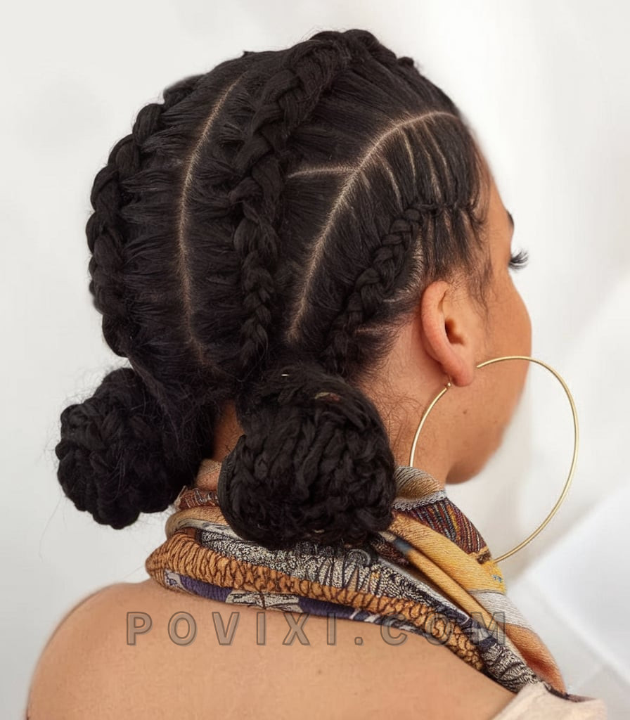 Protective braids meet sculptural artistry in this hairstyle. Featuring thick cornrows that part into two structured buns at the nape, this style is perfect for women looking to keep things cool and chic during intense summer heat. The geometric parts give it an architectural feel, and it’s a great option for both casual wear and professional settings. Apply edge control along the hairline and use a rattail comb to create clean parting lines.