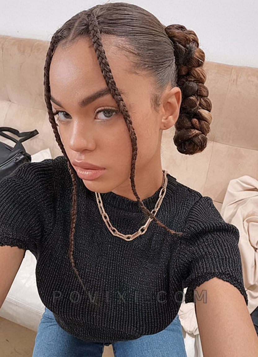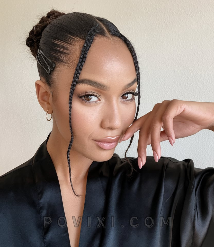 This hairstyle merges elegance and practicality, perfect for both daytime glam and evening sophistication. Two braids frame the face from a clean center part, while the rest of the hair is pulled into a sleek, tight bun. Dual hairpins add a chic accent, locking down any flyaways. This look is ideal for humid summer days when you want a style that stays in place but doesn’t sacrifice edge. A style like this pairs beautifully with minimal makeup and gold hoop earrings for a clean, modern aesthetic.