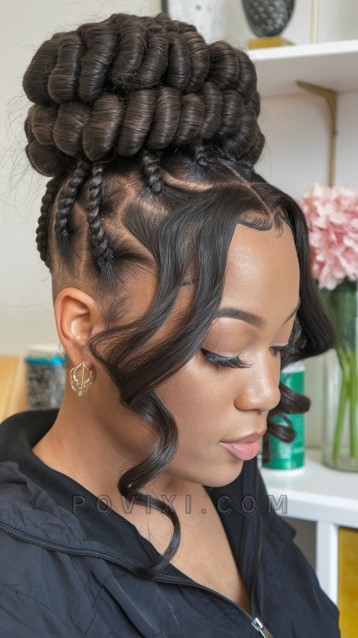 Talk about regal! This intricate crown braid design features a basket-weave pattern at the base, building into a coiled, sculptural bun that elevates the entire look—literally. Polished face-framing curls soften the hairline and add romantic energy. This hairstyle isn’t just a conversation starter—it’s a statement of pride, power, and craftsmanship. It’s perfect for formal summer events or photoshoots, especially when paired with bold earrings and a confident attitude.