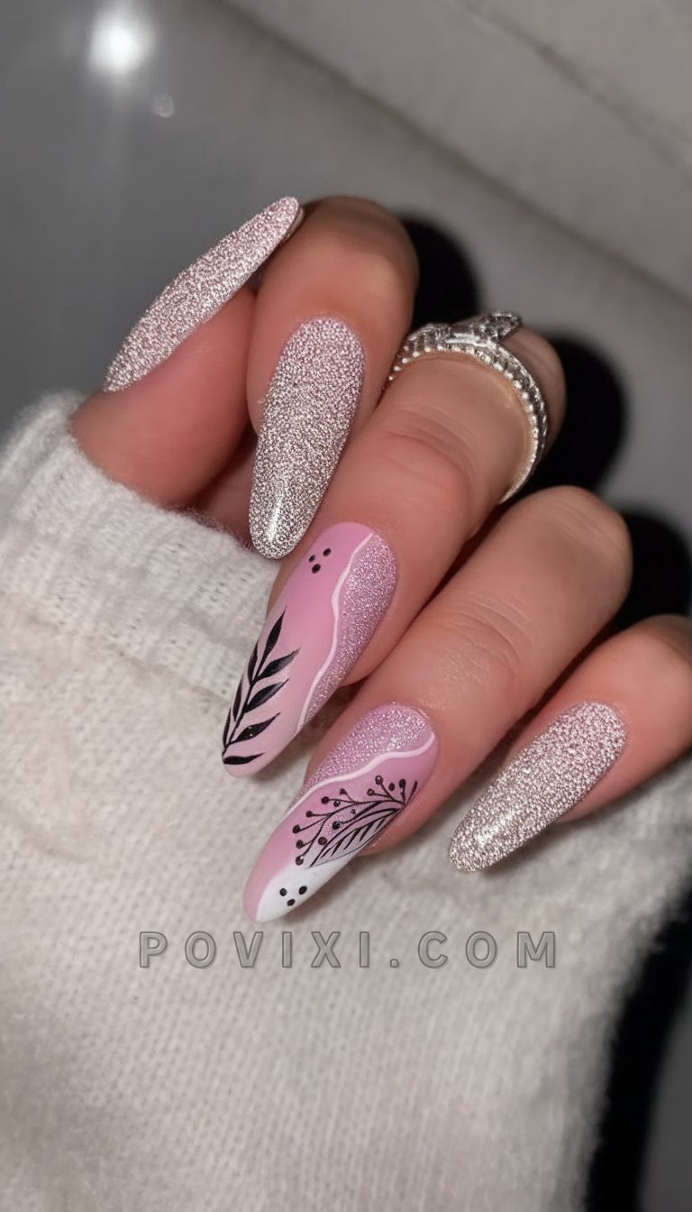 Soft glamour meets nature in this artistic approach to elevated gel nails. The three lines of sparklesugar frosting on the nails contrast elegantly with the two matte pink accents that feature minimal black plant shapes. Your nails get a media-like finish with the flowing white wave that separates the different textures. Enhance your vacation outfit in an outdoor location when you pair white dresses with espadrilles to match the gauzy white dress and espadrilles. The almond design serves both brunch and business needs as it remains practical for drinks as well as professional meetings. The nail design blends sparkling shimmer effects with organic, natural patterns and works perfectly with gold accents.