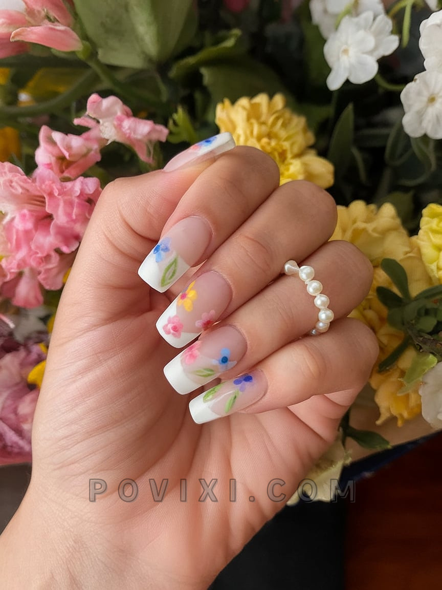 The bouquet of pretty flowers painted across the tip line replaces the traditional white lines of French tips with this positive twist. The base of this manicure appears translucent but nude in tone, so it remains natural, while the flowers bring colorful personality to create a vibrant rainbow atmosphere. The square design is perfect for any occasion, from relaxed workdays to nature-themed ceremonies. Women who want a stunning, fashion-forward nail polish that stays fresh while maintaining its silky appeal will find this design perfect.