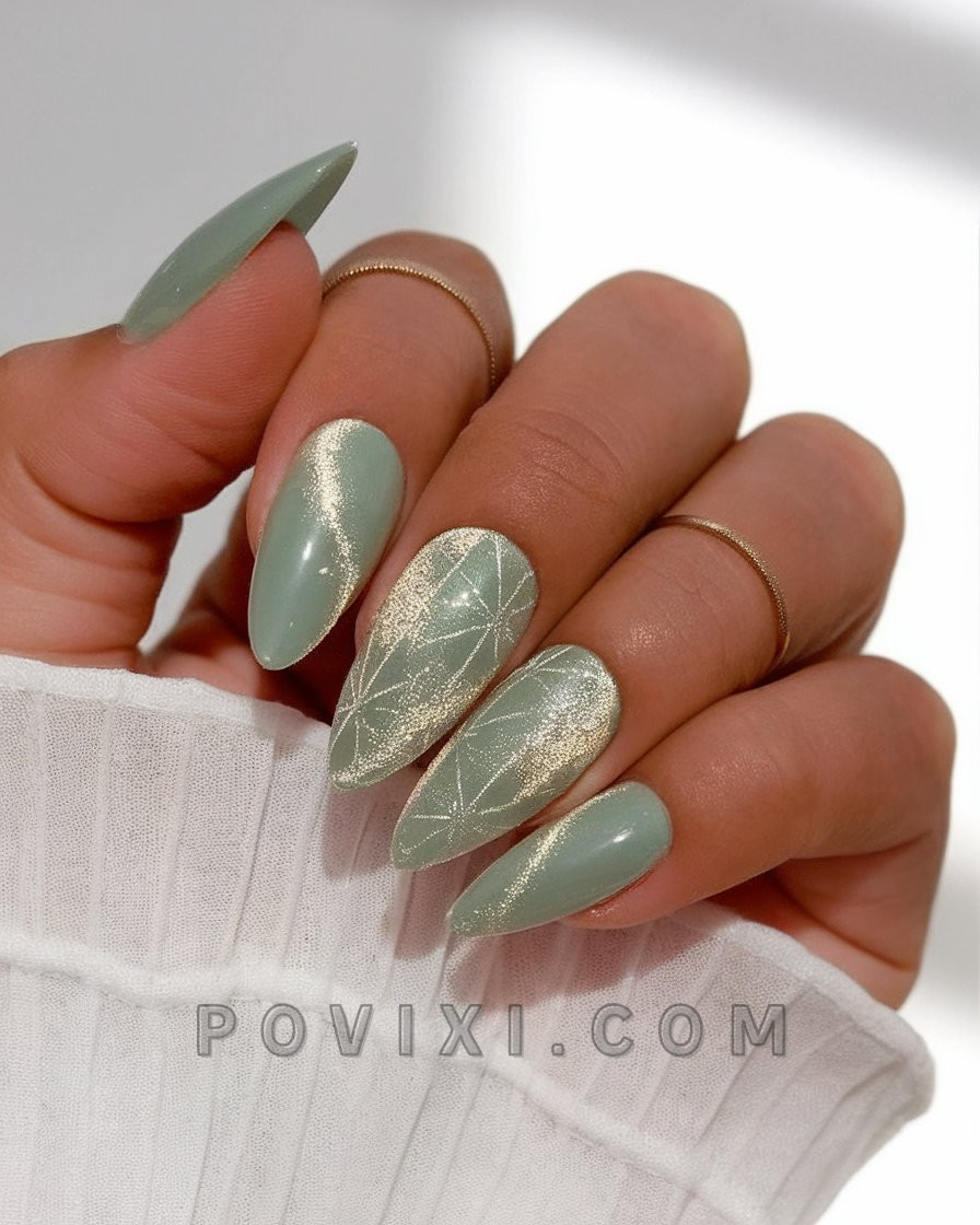 The smooth almond structure appears in a soft sage green next to abstract geometric shapes that combine with shiny gold structures on top. This manicure is for those looking for fashionable minimal styles. The matte base and sharp metallic elements combine in perfect harmony to create a sophisticated natural nail look suitable for any occasion. Those looking for a chic modern style should choose this classic 2025 almond simple essential for their manicure.