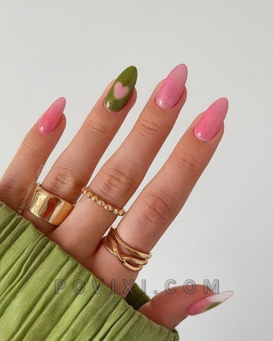 The Almond Nails are a romantic and playful nail design that appeals to young women. A vibrant pink color combines with olive green to create nails with a pastel heart design, making them ideal for dates and picnics with friends. The chunky multicolor combinations in this design create summer energy, while the almond configuration presents itself as a beautifully feminine touch. Pair these nails with flouncy dresses or floral tops to create a fashion-forward, playful outfit.