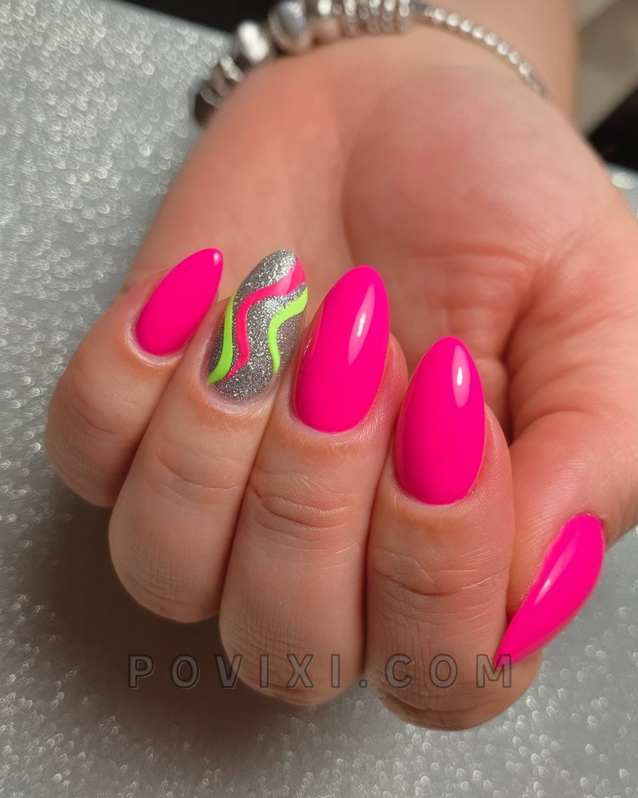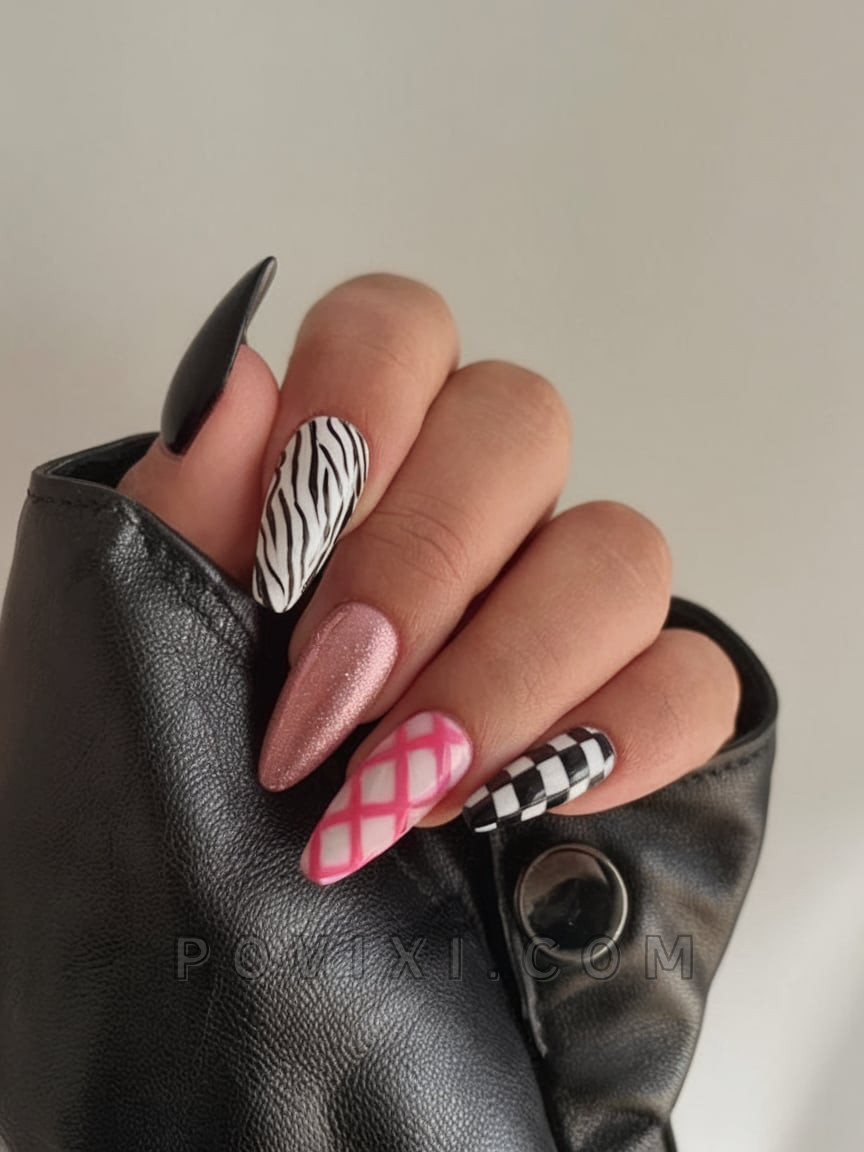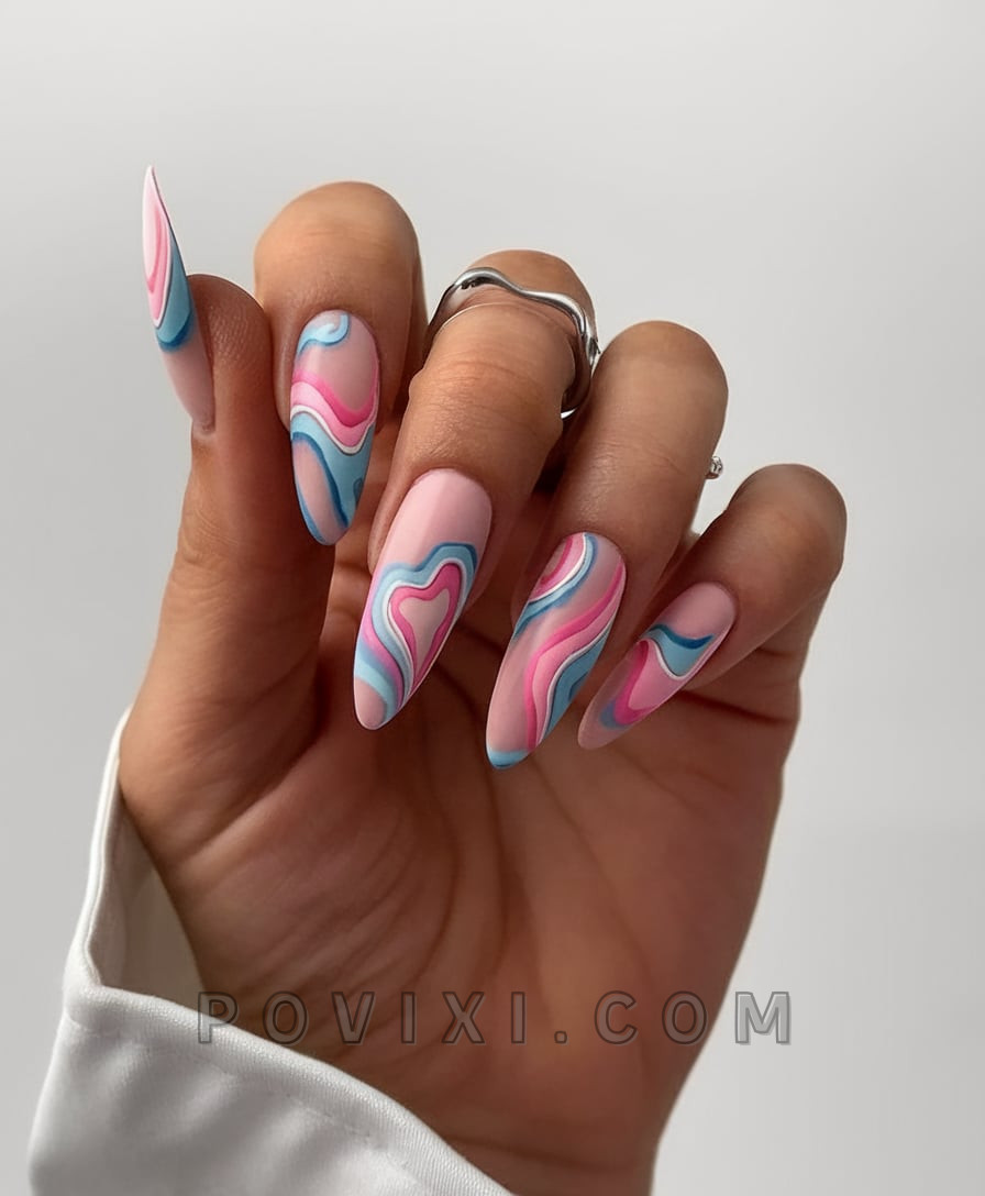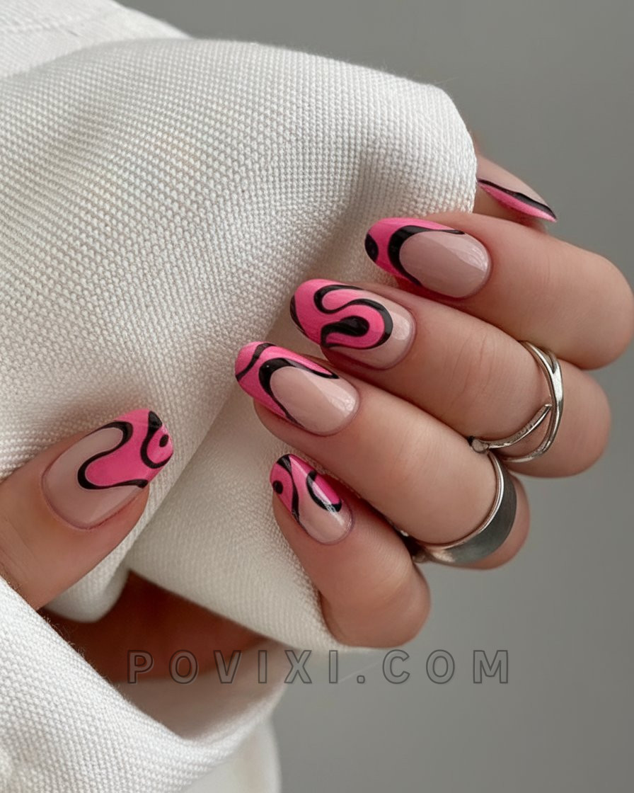 A modern do-it-yourself approach brings the excitement of the disco era by combining fierce neon pink and black swirls on a soft nude background. When vibrant colors meet muted tones, it creates a fashionable look for this design. Wear this design with a simple ponytail combined with winged eyeliner and a cropped blazer for rooftop drinks. This almond-shaped design element tones down the intensity of the design so that the nails remain appropriate for everyday wear without diminishing their bold statement effect. It works for women who love trendy looks but avoid extreme maximalist designs.