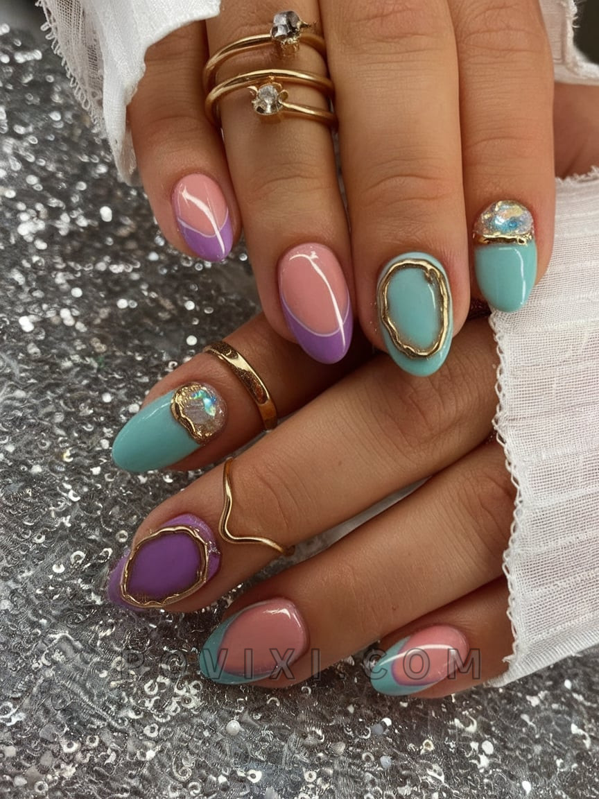 Turquoise and lavender, along with nude tones, join 3D geode accents that resemble precious gems from a display case. The geometric shapes within this design curve into oval shapes that smooth the transition of shiny metallic finishes. If you are planning a glamorous getaway and want your nails to resemble wearable art, this is the design to consider.