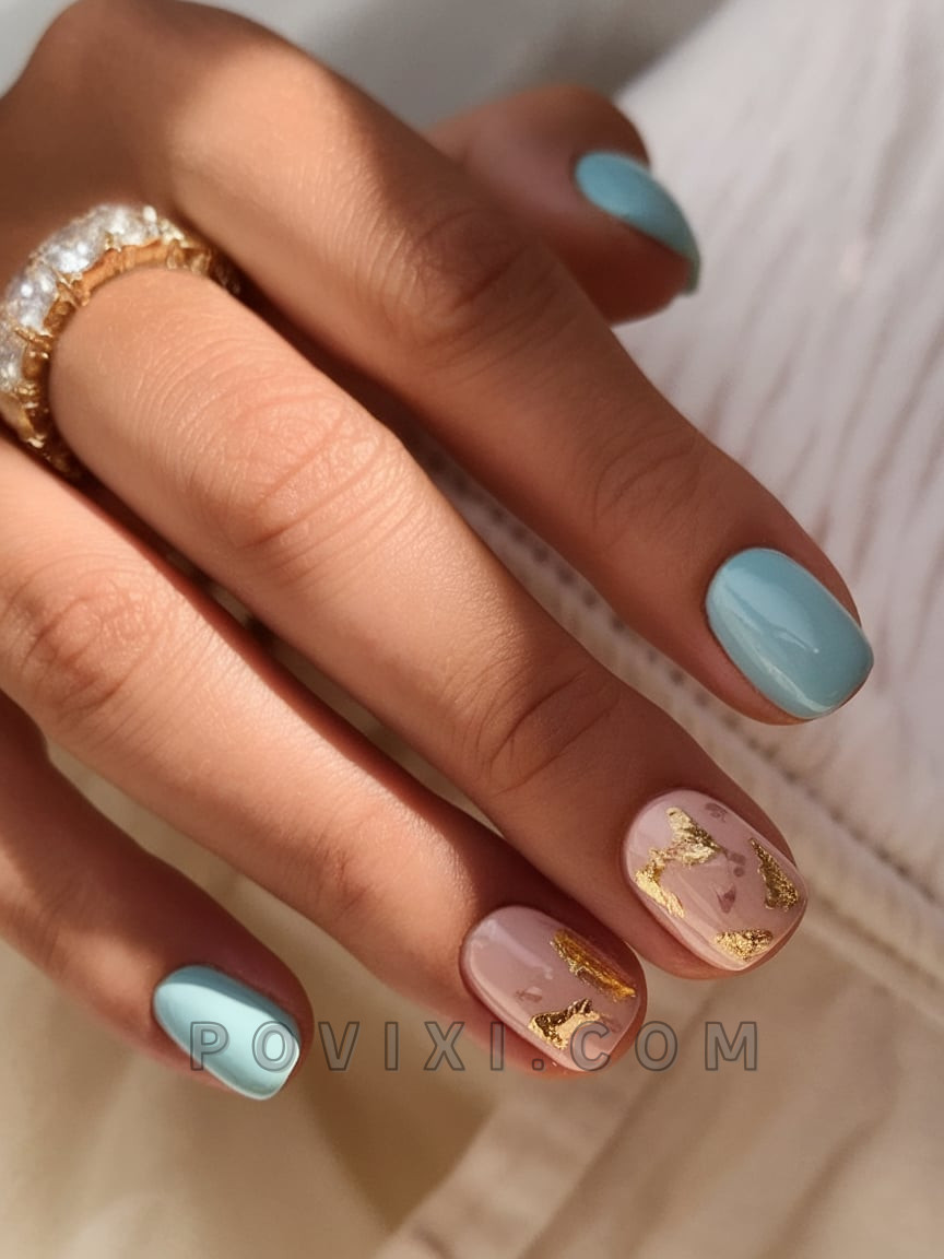 If you are drawn to the simple yet elegant beauty of 2025, this is the style for you. Rounded, short-length natural nails are transformed by a sophisticated mix of blues paired with elegant neutrals that use foil. The light and sophisticated dip nail design offers an elegant and breathable style that is perfect for both you and your wedding guests as well as outdoor dining.