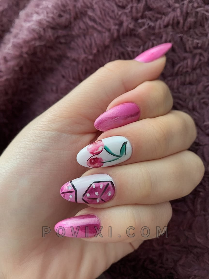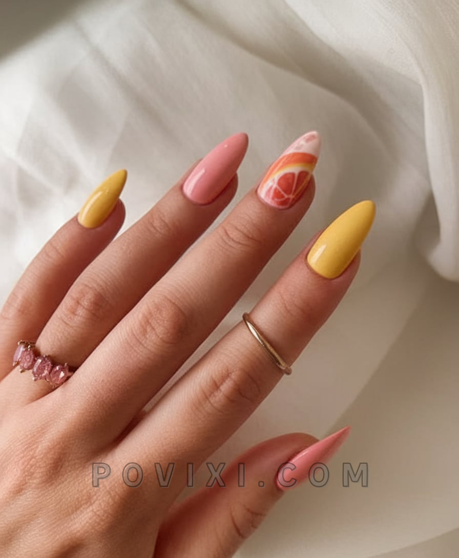 This simple almond set features a citrus slice design on yellow and pink hues, making it ideal for beach days or picnics. A playful, fruity design creation combines with solid, solid designs to create visual harmony. This nail design features bright summer elements that create a stylish, fresh and playful look that truly captures the charm of summer. The design is suitable for summer events from food vendors to weekend getaways.