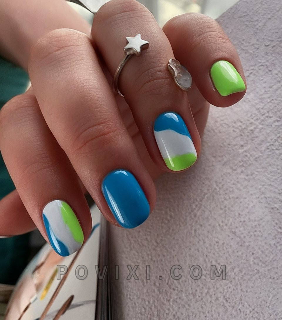 Short squoval nails welcome bold color blocking as an artistic display. Wavy lines between ocean blue and neon green and white conjunctions become the perfect poolside cocktail template. The chiellux gel nails provide the perfect manicure solution for sporty women and people who love exciting colors.