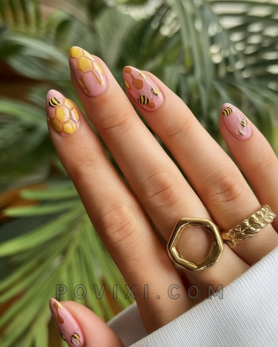 Gorgeous almond pink nails are combined with tiny bees and golden honeycomb patterns in an adorable summer design. The design manages to be charming yet practical for everyday wear. Those who prefer their natural nails will love this design as it offers a creative alternative to their regular style. The stylish combination includes linen sets worn with earthy tones to create a stable summer ensemble.