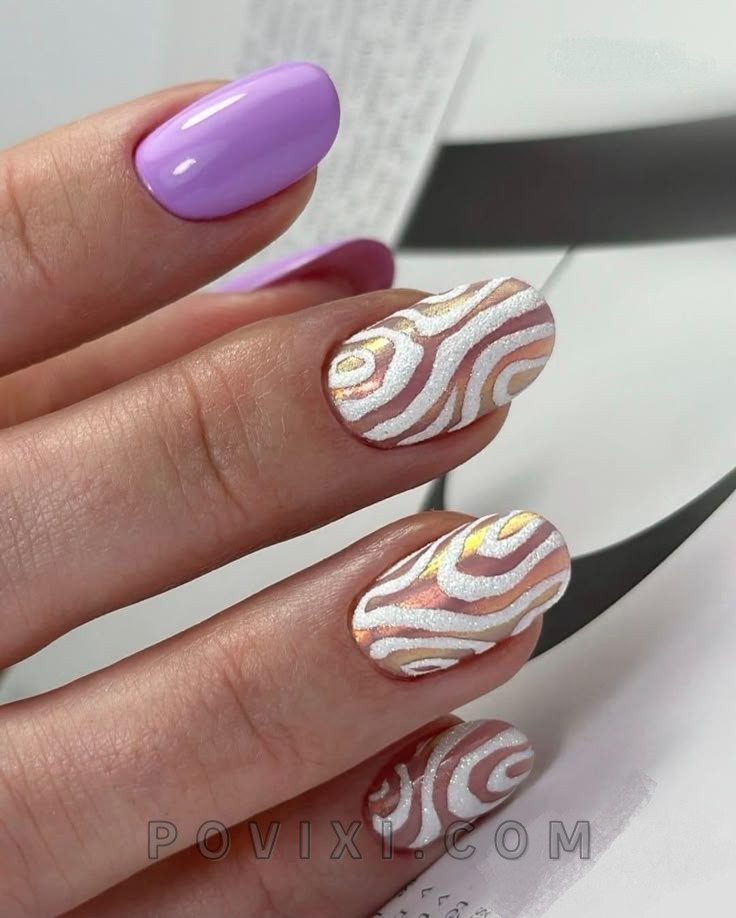 Think soft glam with a psychedelic twist. A unique combination of lilac solid nails and topographical metallic swirl effects adorns the accent nails of this design. The design transforms summer patterns into a luminescent representation of organic shapes that capture a fantastical interpretation. The creamy purple base creates an elegant and serene look suitable for weekend relaxation or an art gallery happening. The accent nails enrich the look while maintaining an elegant balance on the eye, so this style suits the 2025 simple lover who wants an elevated interpretation. This design harmonizes perfectly with natural nails as it reveals your base nails while keeping the detailed artwork alive.