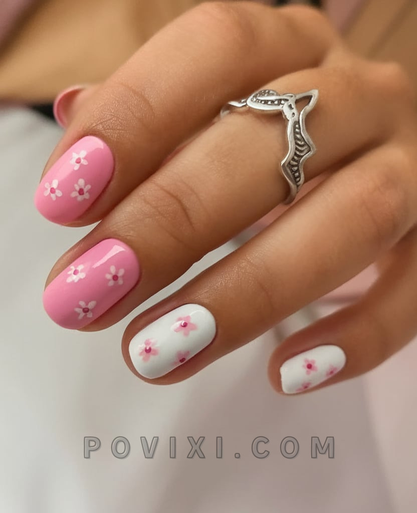 These 2025 simple nails appear as rounded and short designs to create an innocent, charming appeal. The base nails alternate between white and pink, and the designers apply tiny daisy flowers with pink centers to each of these bases. Ideal for casual weekends and brunches, these pair perfectly with soft denim or airy skirts for a full sunshine aesthetic.