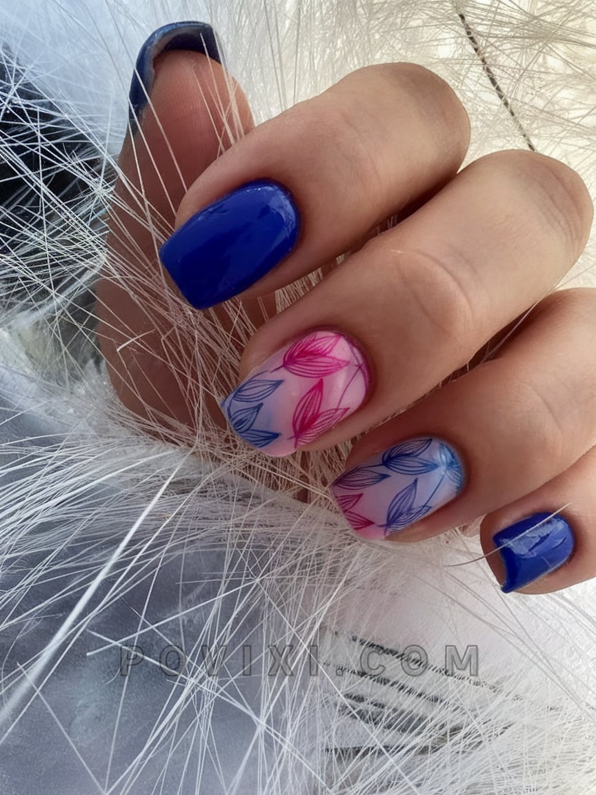 A gel nail design blends vibrant solid color with blown-out gradient technique. Square nails feature a bold cobalt blue tone that blends perfectly with accent nails featuring 2025’s simple petal design in ombre pink and blue. This look expresses both artistic elements while demonstrating a vibrant energy that captures the essence of summer liberation. People who prefer a simple look with a strong visual impact should choose this style. The Afresh look pairs well with dresses and white linens for a refreshing twist.