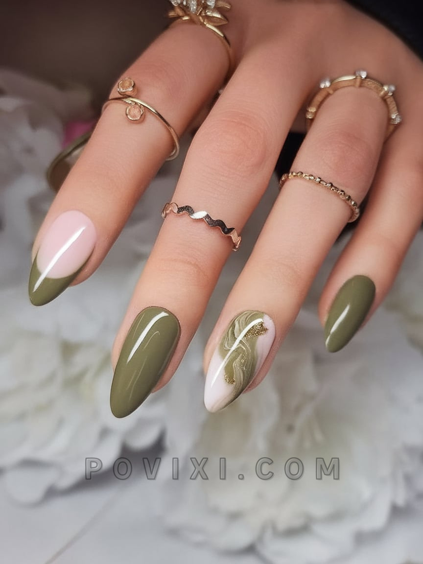 This almond-shaped manicure with rich olive-green nails captures the earth tones that will be popular in 2025. The standout feature? The marbled accent nail features movement between sage swirls and subtle gold touches for a luxurious vacation aesthetic. This design offers both elegant style and modern appeal for users who desire understated, earthy glamour. Gel nails are designed with a natural nail finish to achieve a simple almond shape. Wear complementary gold accessories paired with elegant beige or cream fashion items for a sophisticated look.