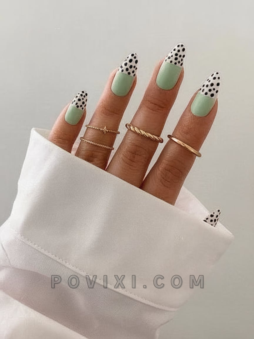 This Fresh Start design features mint green colors with black and white dalmatian dots, ideal for 2025 square nails. The squoval cut incorporates modern functionality by revealing clean lines along with rounded corners. Fashionistas who appreciate both minimalism and graphic style should opt for this design as it offers an elegant and eccentric twist. This mani stands out due to its combination of pure white button-up shirts paired with black accents.