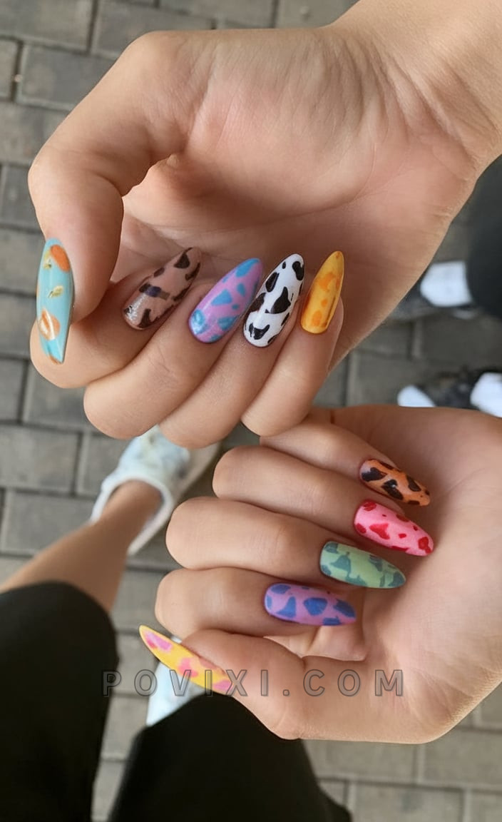 The animal print palette moves from one color to another along a spectrum. The almond nails in this set feature electric blue and neon pink as well as soft pastels and oranges arranged in a wildly creative multi-colored spot pattern. The dangerous coffin shape makes a bold statement and is perfect for rocking out at festivals or rooftop parties and taking fashion risks on your travels. Make your nails stand out by choosing solid, neutral clothing that draws attention to your stunning nails.