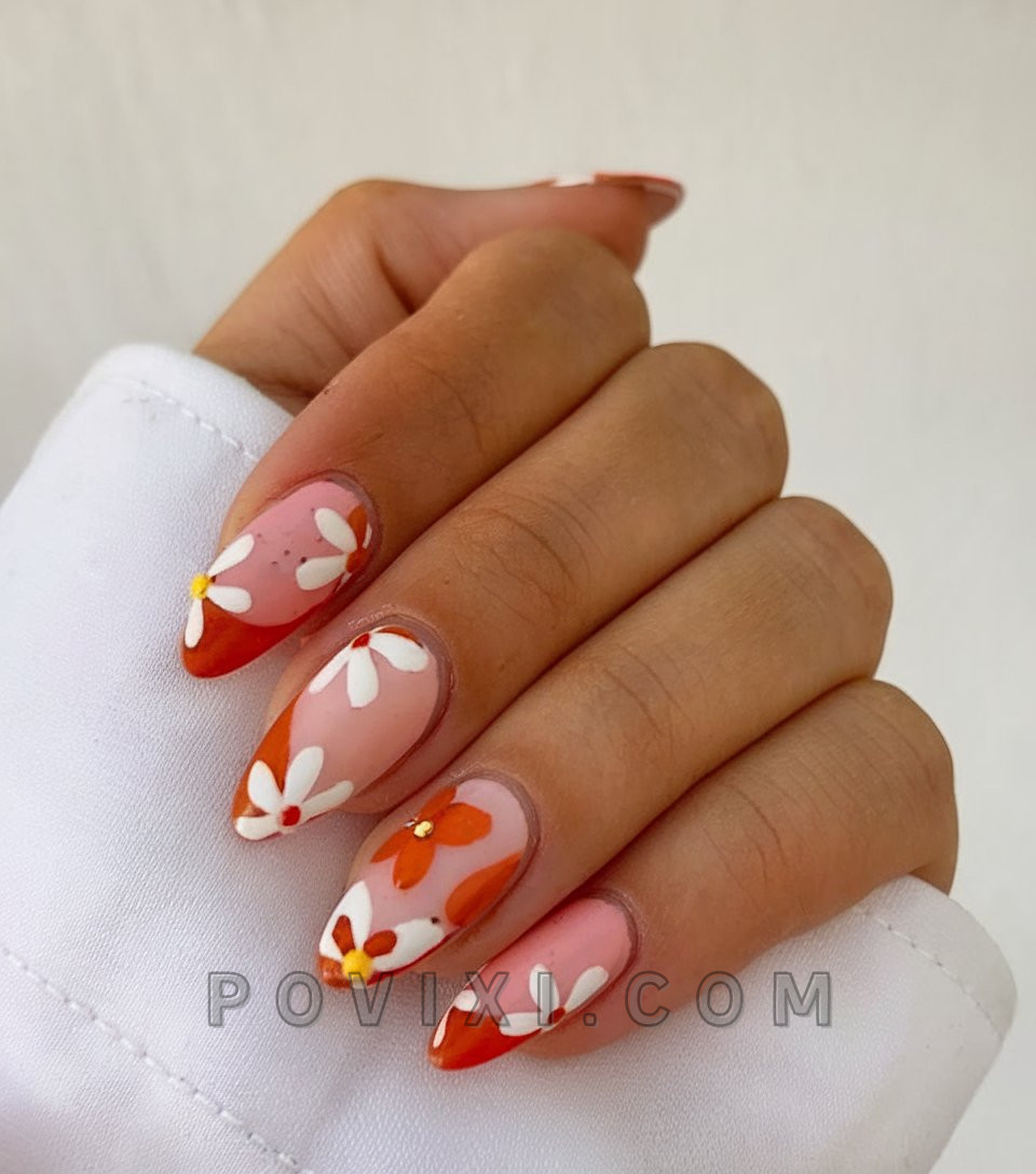 Achieving a golden hour look is easy with this 2025 simple manicure, which combines burnt orange French tips with a sheer pink base and daisy patterns. The almond-shaped nails remain smooth, but the daisy flower decoration adds a playful dimension to the design. The nails present a simple yet lovely look. Airy dresses in shades of orange or yellow or a cute romper for that garden party feel.