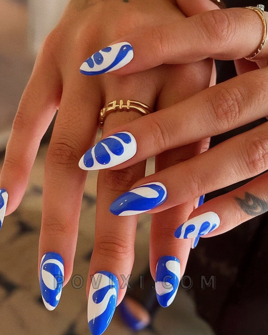 Bright, solid shades are paired with bold design motifs for an eye-catching dual effect. The glossy red almond nails will undoubtedly set you on fire. The combination of two black and white marbled swirl nails and glossy red almond nails creates a dramatic ensemble that suits individuals who love dramatic appearances. Wearing this gel look projects an aura of powerful confidence, so it should be worn for rooftop parties as well as sultry summer nights on the town.
