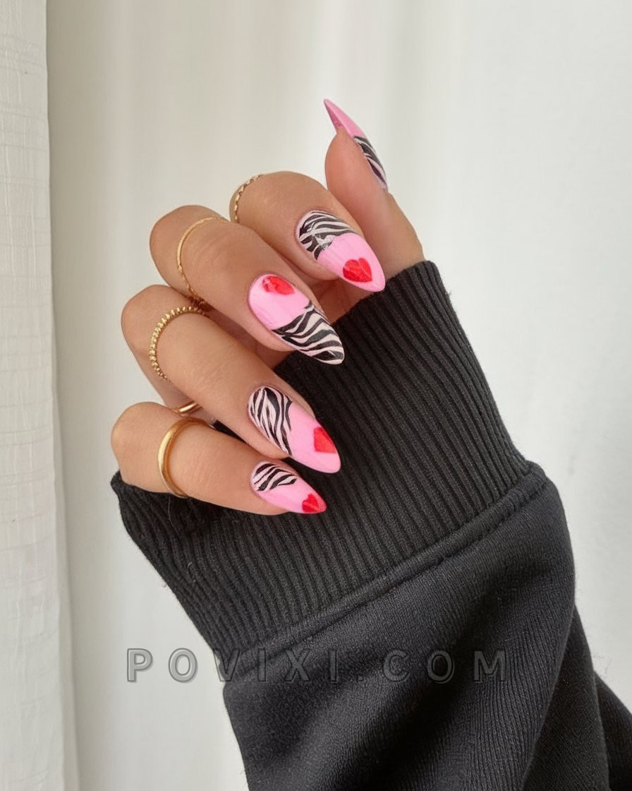 The 2025 almond simple set combines powerful and flirty elements in its bold design formula. These nails make a bold statement as their blush pink background features alternating zebra stripes along with red heart designs. The almond-shaped nails maintain their stylish elegance with a frame that showcases an eye-catching, fun design. The almond shape is a perfect fit for any hand while providing enough length to avoid extreme length. Wear a cropped black hoodie with statement rings for a casual street style look.