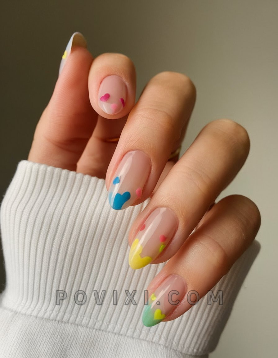 For those who like to imagine the future, this artistic style gives fingertips a makeover. The charming nature of the manicure comes from the rainbow-colored hearts arranged on the nail tips to create a contemporary French manicure look. The transparent base stays nude and light on the nails, so you can stay comfortable during hot summer days without losing carefree joy. Anyone looking for a short manicure should choose this design as it is great for holiday and baby showers as well as remote office style enhancements. Minimalists who want to experience multiple nail colors can choose this design with tiny hearts because it keeps the base looking natural while adding subtle color to their nails.