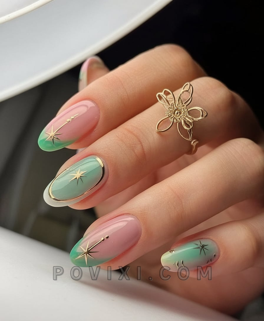 A set that captures the essence of summer enchantment brings all the celestial charm to our nails. The nails feature a gentle transition from pale mint to soft blush along the length, which hosts golden star cutouts and delicate dots across the surface. Styling this delicate, creative color combination will transform you into a fairy princess for your formal summer events and beach outings. This muted color palette is for those who desire understated elegance and a distinctive personal style. Metallic sandals and soft linen dresses would complement this style perfectly when paired with a sun-kissed tan.