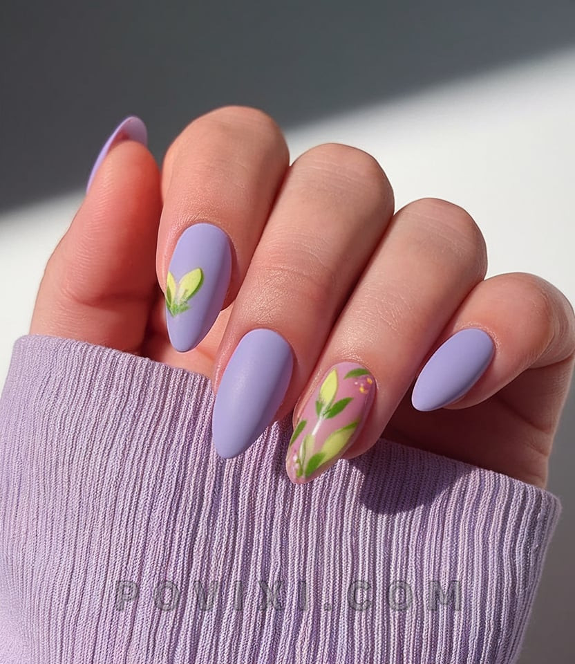 A sophisticated matte lavender design is given botanical detail with hand-painted floral decorations on two nails. The integration of earthy yet sophisticated soft purple with fresh pops of green creates a mesmerizing effect. The set pays homage to dip nails with a durable, velvety finish that stays on smoothly. People who want to get away from shiny and sparkly nail designs will find these designs suitable. The square, sloping shape of the nails maintains a clean look that complements the delicate botanical designs. Think lavender fields in Provence with a lavender latte in hand.