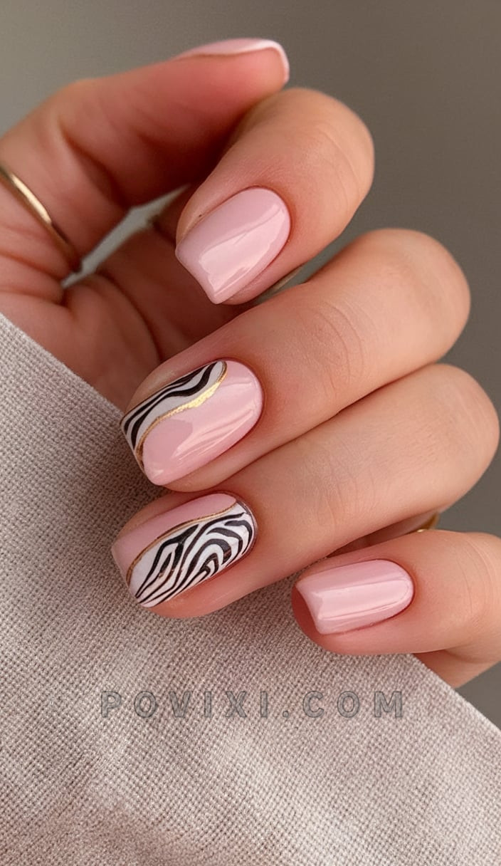 When corporate women want style, elegant pink with metallic gold stripes is the perfect match. Warm pink solid nails are given an edgy sophistication by combining them with zebra print decorations highlighted by gold foil lines. The combination of zebra print and soft blush with the 2025 square nail shape creates a strong and elegant look. People with an eye for modern fashion trends will perceive this nail style as professional and suitable for editors or stylists due to its design. To complete the look, pair with a blazer and chunky gold rings.