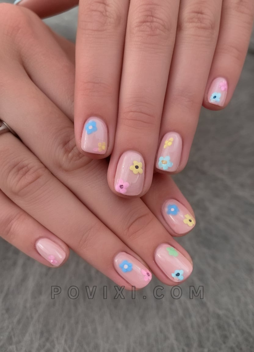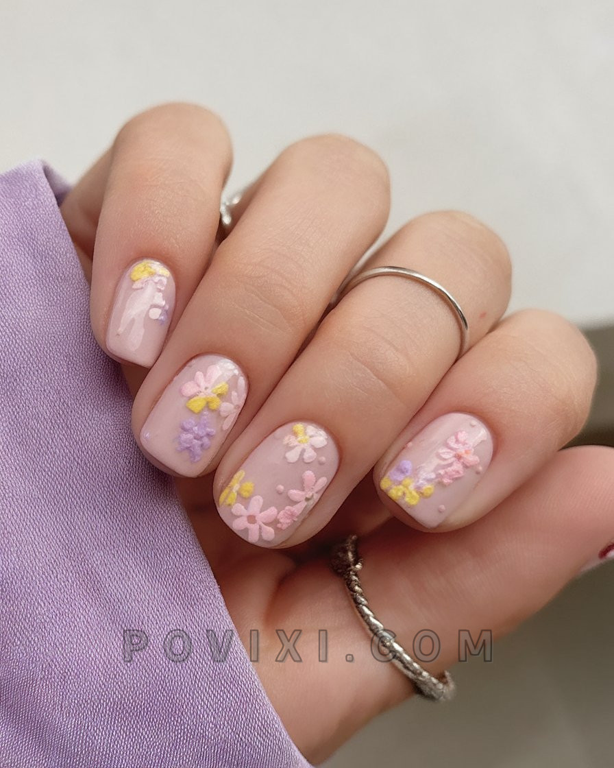 Detailed daisies and baby flowers on a glossy pink base create a romantic look for short nails. The minimalist natural nail look is combined with a sophisticated feminine touch that is equally at home at a beach picnic or summer garden party. The small flowers that mix white, lavender and yellow keep just the right amount of vibrancy without going overboard. This style is perfect for women who want a natural-looking, elegant nail design without going overboard.