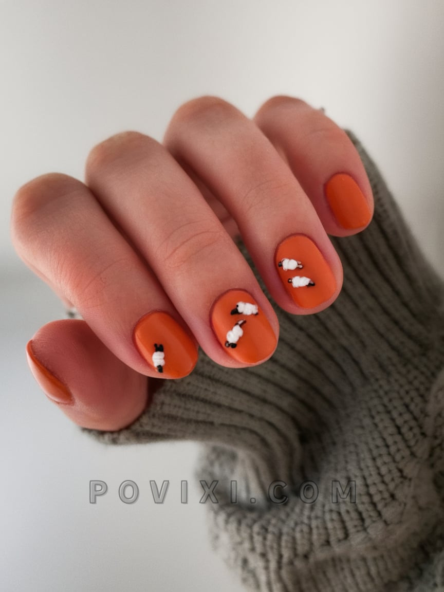 Experience a hepatic orange nail look with tiny white carrots that offers sincere playfulness along with simplicity. This nail design offers a playful take on classic manicure art, seamlessly combining vibrant colors with a country appeal. The square style of the nails gives the designs an organized look, making them perfect for everyday use on hot summer days. When wearing this look, pair it with oversized clothing in neutral tones for a relaxed contrast.