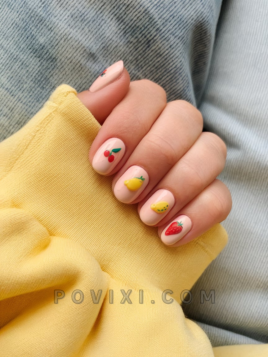 This summer-ready ensemble captures the essence of fresh, juicy content. A perfectly illustrated assortment of cherries and peaches, lemons and strawberries adorns a hand with a glossy natural base. The nail style works well with natural nails and soft gel overlay and includes playful designs complemented by basic round nails for versatility and daily wear. Sip a fruit smoothie while wearing your comfy denim with an oversized yellow hoodie for an effortlessly cool outfit.