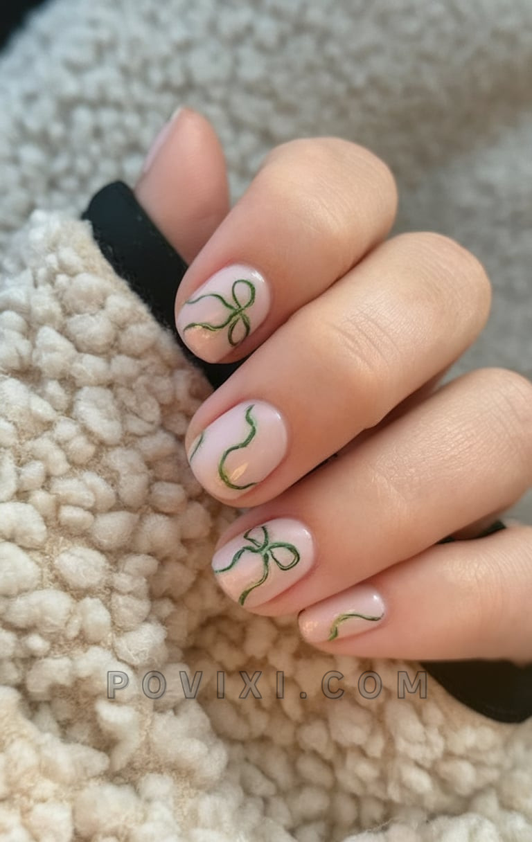 The green ribbon swirl pattern in this minimalist design adds style and sophistication to any garden party. The light pink background provides a natural look and the curved green lines add a soft, elegant element to the design. People who prefer contemporary 2025 styles but still want unique details should choose this design. Green ribbon swirls look great with winter-neutral outfits, while you spend hours sitting by the fire on the beach or wandering through summer markets.