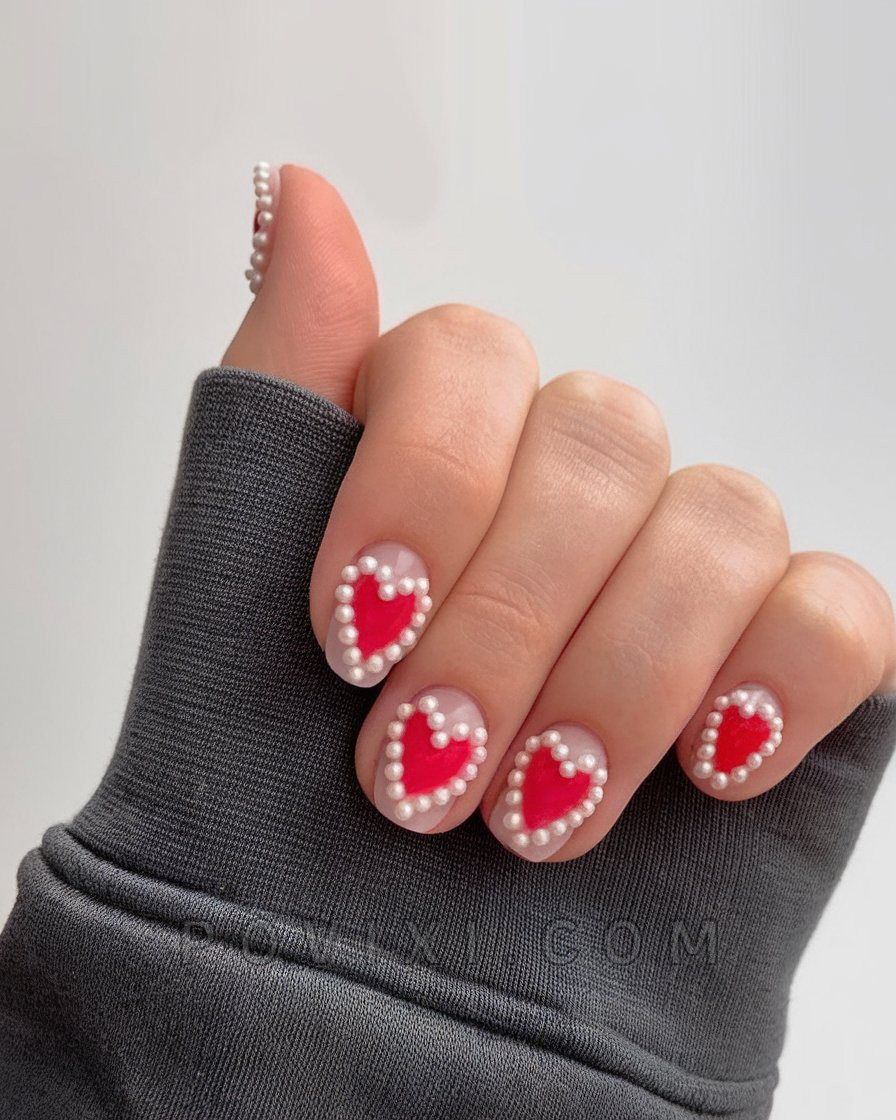 To create this beautiful nail art design, artists used delicate pearls surrounding vibrant red hearts. The polished nude base allows the accessory glitter to stand out without being overwhelming. Short, rounded nails get the perfect treatment in this aesthetic that delivers total feminine charm. The design is ideal for romantic occasions and works well with more casual outfits such as knit dresses and layered cardigans.