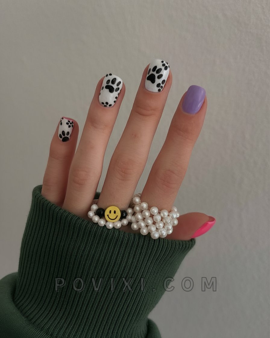This versatile set features bold black paw prints on white canvas with complementary purple and hot pink accents. The strategic positioning of the colors creates an appealing mixed bag look that works well with the efficient colorblocking technique. These nails work well with short acrylic and dip styles, which will appeal to people who like animals and bright, bold designs. The chunky rings and playful sweater cuffs? A carefully curated set of accessories accentuates this edgy, girl-friendly look.