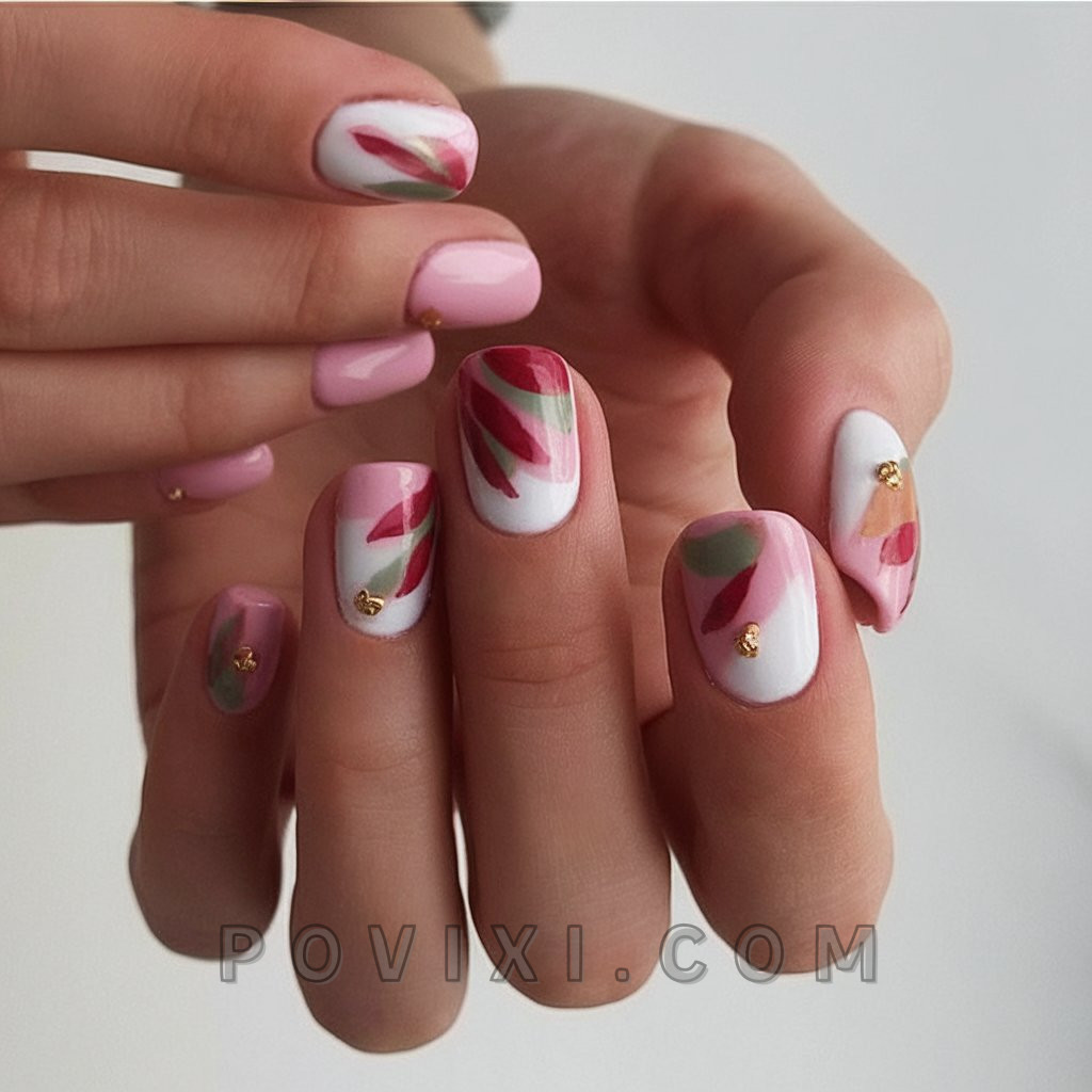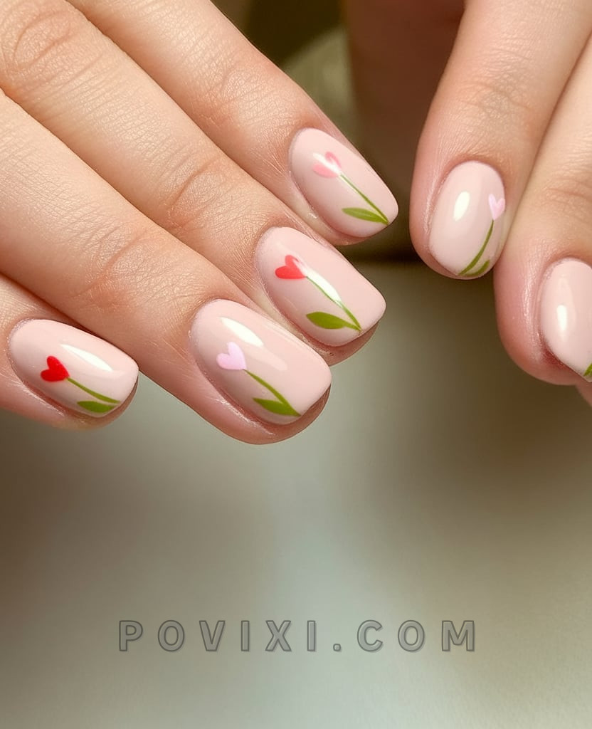 This design combines the qualities of adorable and inventive design techniques. A heart-shaped flower in delicate pastel reds and pinks stands in the place of each tulip on the fingertip of each design. This design on naked manicured nails appears as a simple hand-drawn garden scene from a pastoral youth. These nails have an oval shape that creates an ideal length for natural fingers and look great with linen outfits when worn with sandals on summer walks.