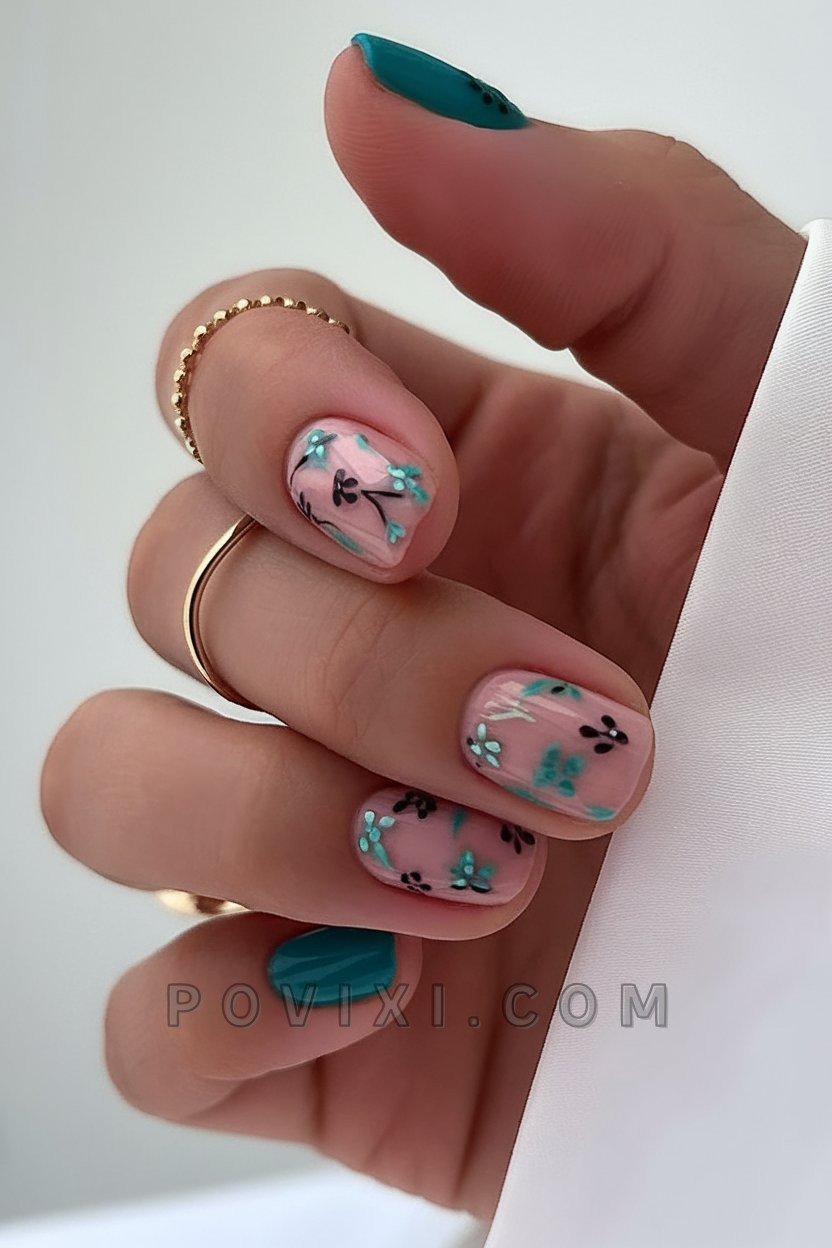 The design features delicate blue, black and yellow flowers moving across a nude background. One nail is completely covered in teal for a striking color accent that creates both depth and edginess. People looking for fashionable floral designs from 2025 will especially love this nail art pattern. The squoval nail shape creates a comfortable and fashionable style that works well for picnics as well as poolside brunches.