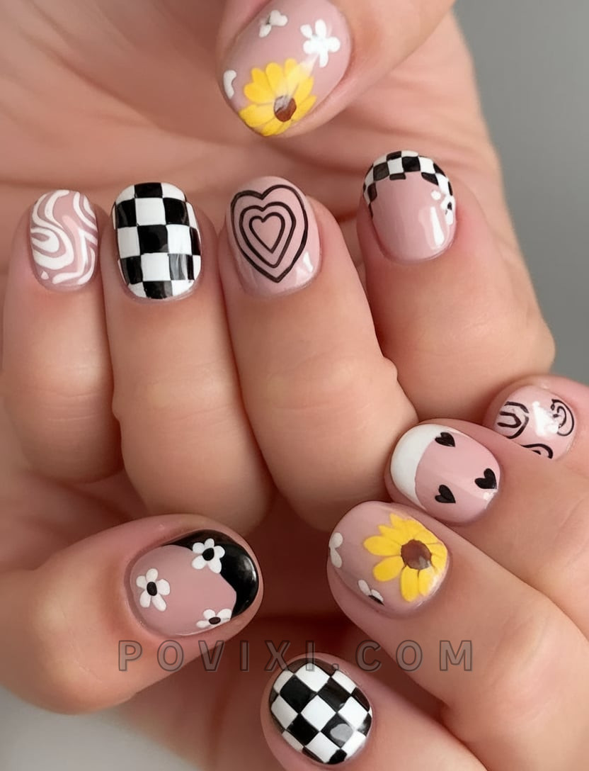 This nail set combines playful design aspects of checkerboards, hearts, smiley faces, black and white patterns and sunflowers into one harmonious color spectrum. Retro stickers from your childhood come to life as nail designs. Applying this design works best with gel or acrylic, as users prefer creative, eye-catching nail art. Match your graphic print t-shirt and shoes to achieve the coolest feminine look of the summer.