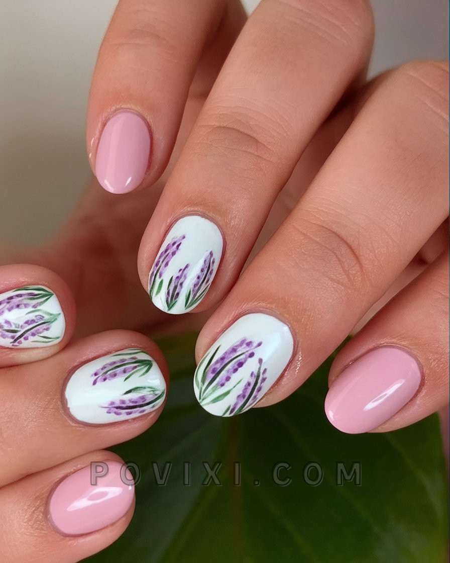 A hand-painted lavender pattern with a palette of white and pale pink is for those who want to combine natural beauty with elegance. The hand-painted Provençal aesthetic of this detail appears as an elegant dream from nail art traditions in a softly vibrant way. A short oval nail length complements the shape of the hand without adding complexity to home care. This design is for people who want a sophisticated style compatible with bare nails and relaxed clothing choices.