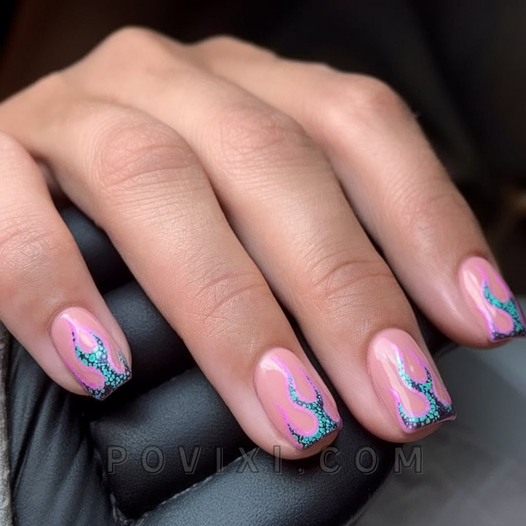 The combination of bright pink and teal through these edgy flame tips creates electric energy while adding holographic visual elements. These unique designs feature the rebellious spirit of the 2000s adapted to the elegant style of 2025 through their glossy nude base application. Acrylic and gel aficionados tend to choose these tips as their favorite touch of sparkle paired with chrome and dramatic shine. Perfect with a leather jacket or metallic accessories for a standout summer look.