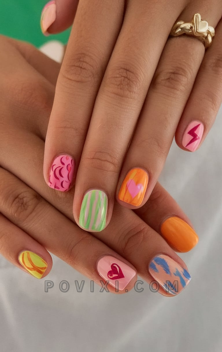 Individuality is the defining characteristic of this year’s summer mood. A colorful mix of pink flames and green stripes on an orange checkerboard sits on natural nails alongside electric blue curlicues. The handmade artwork transforms your fingers into your own personal art exhibition. People who like to make bold fashion statements should wear this nail design as it goes well with color-blocked clothing and statement jewelry. Nail art enthusiasts consider this trend to be one of the top choices for 2025.