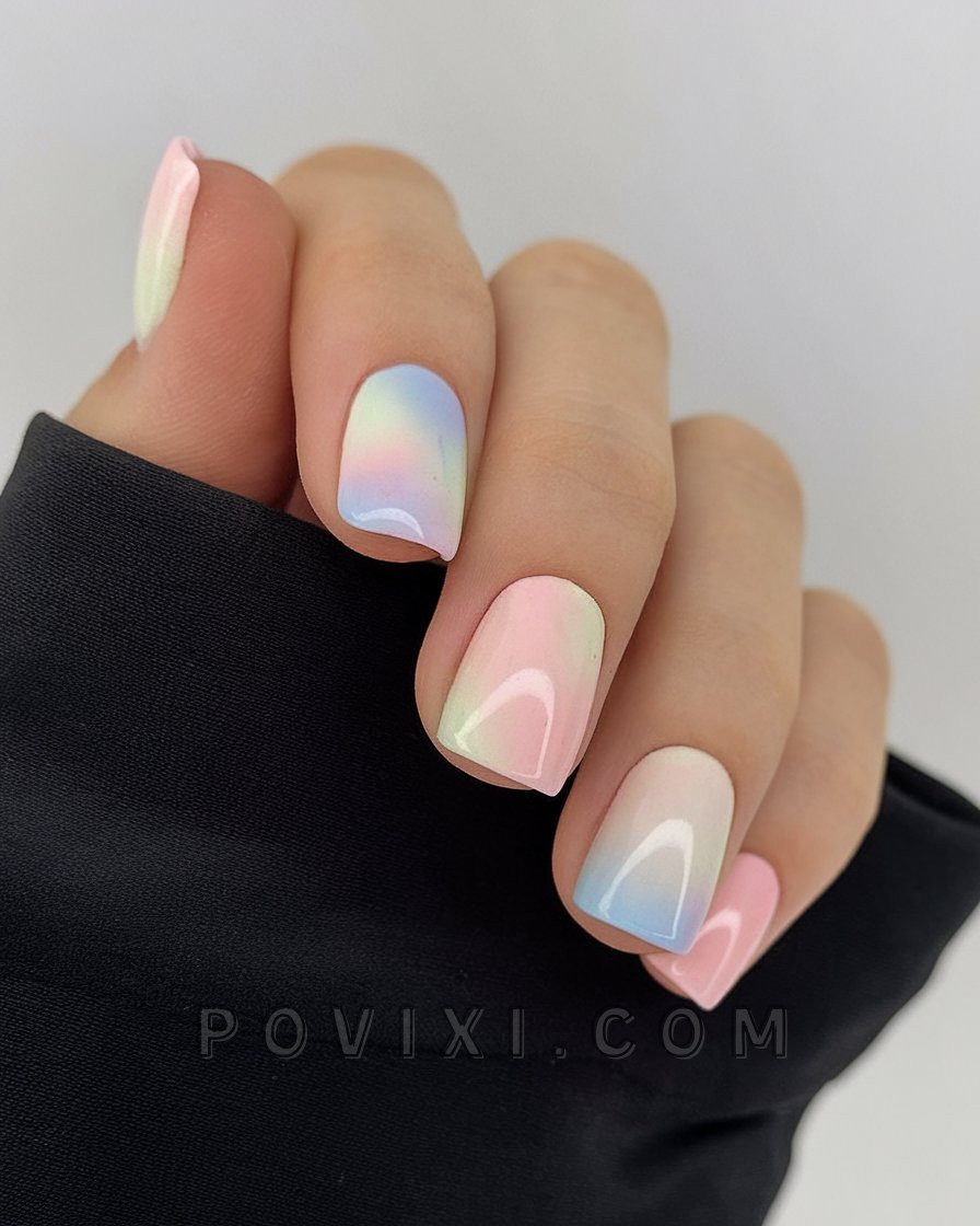 A romantic pastel gradient moves from white to soft pinks to pale yellows and blues to violet pastels. The ultra-glossy gel top coat gives the nails an out-of-this-world glassy finish. This elegant gel nail design is perfect for weddings, baby showers or beach brunches and gives the wearer a striking grace. This squoval nail shape provides an elegant and feminine shape for the manicure.