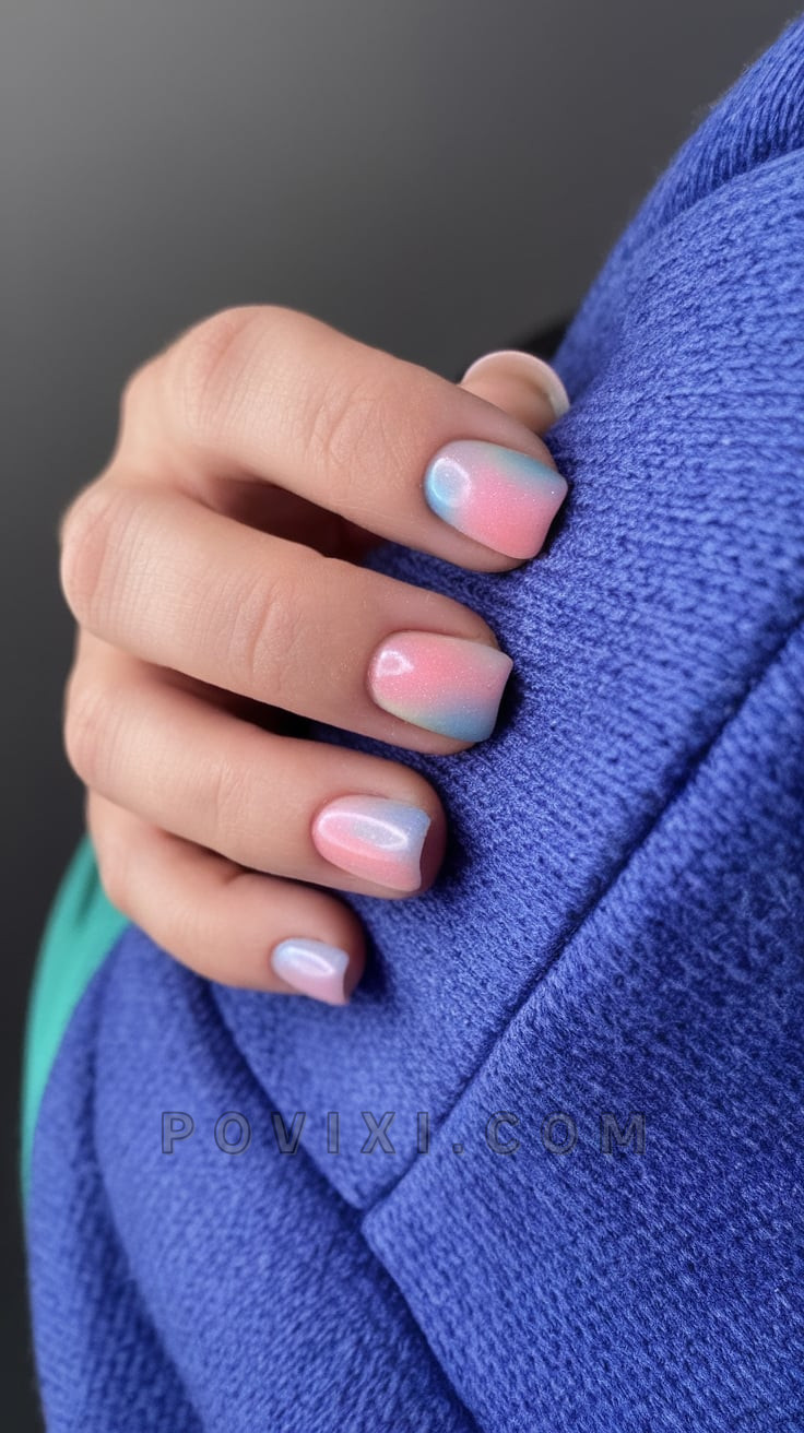 Anyone who sees this chrome pastel shift will immediately feel energized as if they were under a cloud nine effect. The pale pink with purple and blue glitter presents a soft 2025 chrome-inspired trend. The gradient looks great on short, square nails as it combines an otherworldly quality with elegant polish. Pair your monochromatic outfit with pale or cool tones to let your nails take center stage.