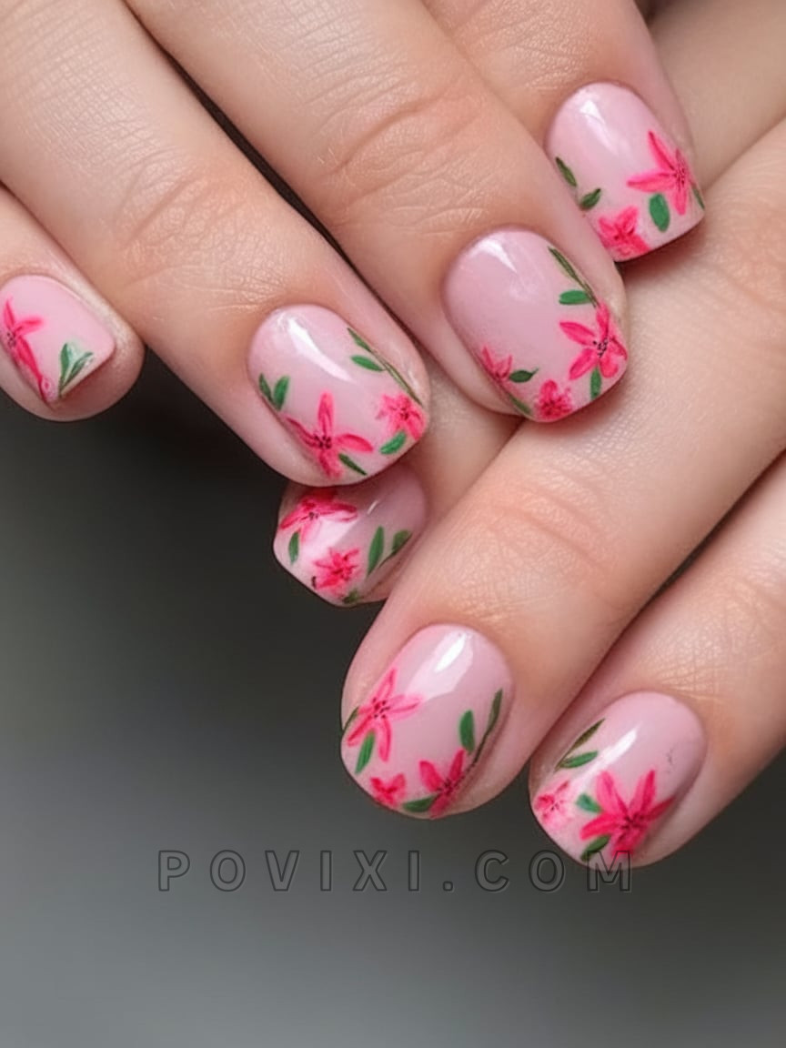 A hot pink floral design spreads across each finger of your hand to create the look of an island goddess. The beautiful nail art design achieves balance through its detailed structure along with negative space elements against a traditional natural base. These nails serve as an emerging 2025 trend that suits women who want an elegant yet bold decoration on their nails. The design goes well with beach maxi dresses in white and layered gold jewelry.
