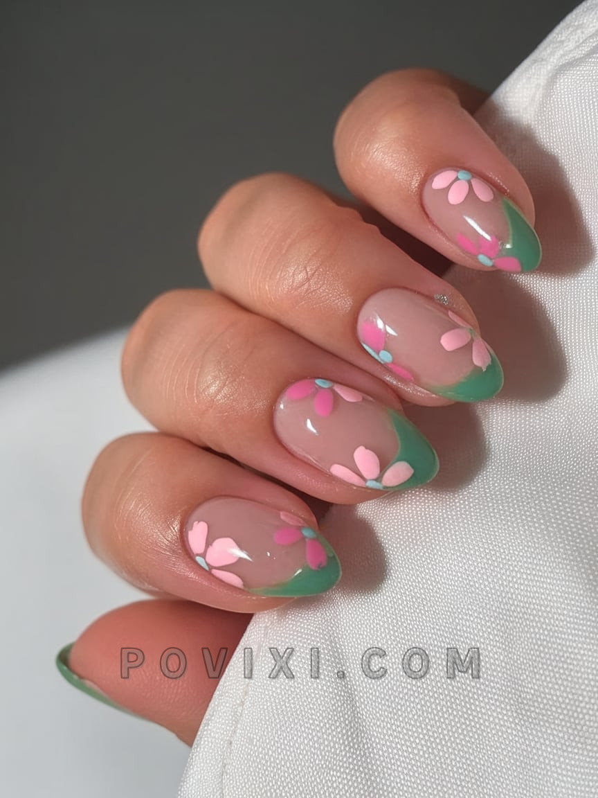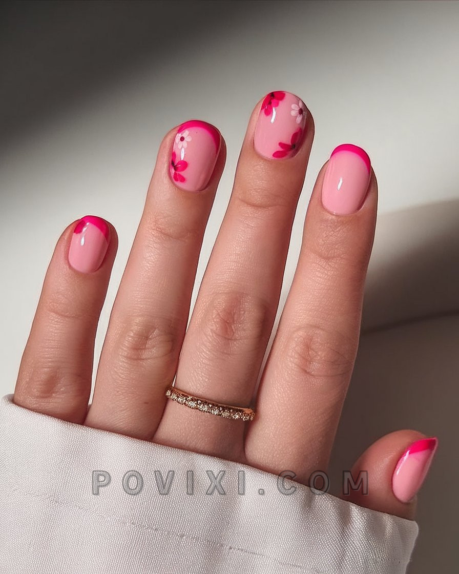 The manicure technique combines simple natural pink tips with playful floral prints that decorate specific nails. The design achieves an unusual gel-classic harmony that makes it highly wearable. The shape of the round and oval nails alternating on each finger emphasizes the delicate aspect of this design. This manicure is perfect for a professional office look or a casual summer outfit, especially when paired with a pink slip dress and an ivory blouse.