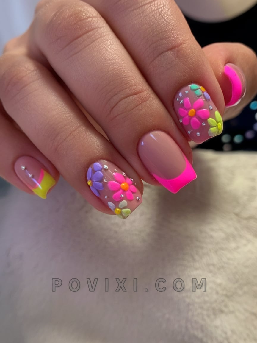 This manicure is fun because it combines texture with a whimsical color combination. 3D daisies in various bright colors sit on natural gel while hot pink and citrus orange neon tips decorate the base. Some white dots serve as a background for a 70’s festival retro flower power theme specific to 2025. The eye-catching and playful elements of this decoration are perfect for holiday and festival ensembles when paired with bold colors that express bold personality.