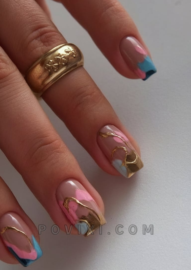 One word: art. The combination of contemporary painting techniques with glamorous elements defines this nail set style. Abstract shapes in blue, pink and nude overlay a gel resin that is accented with golden metallic touches that create shape and premium quality. This look achieves an editorial look as it resembles designs seen on fashion catwalks, despite the use of short nails. The design is for those who love modern trends because it provides glamorous nail styles while remaining short. The transformation of ordinary natural nails into extraordinary works of art through artistic techniques exemplifies this masterpiece level design.
